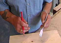 Nu gaan we de gaten afschrijven op het klos van de kruk en de cilinder. Dat gaan we op de volgende manier doen. Bij het hart, het midden, van dit krukgat zet ik een streepje en bij het midden van het cilindergat zet ik ook een streepje. Als ik het midden niet precies weet kan ik ‘ m ook uitmeten.