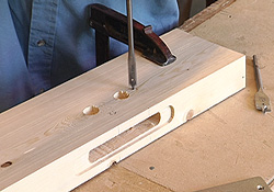 Nou blijf je toch vaak wat kantjes in het gat houden. Ik heb daarvoor een rattenstaart, dat is een beetje ruwige ronde houtvijl, om die splinters hier eruit te vijlen. Tevens kan ik hiermee zorgen dat de gaten recht tegenover elkaar blijven/gaan zitten. Doe dit serieus want anders heb je later kans dat er houtsplinters in je slot terechtkomen en dat je slot gaat weigeren.